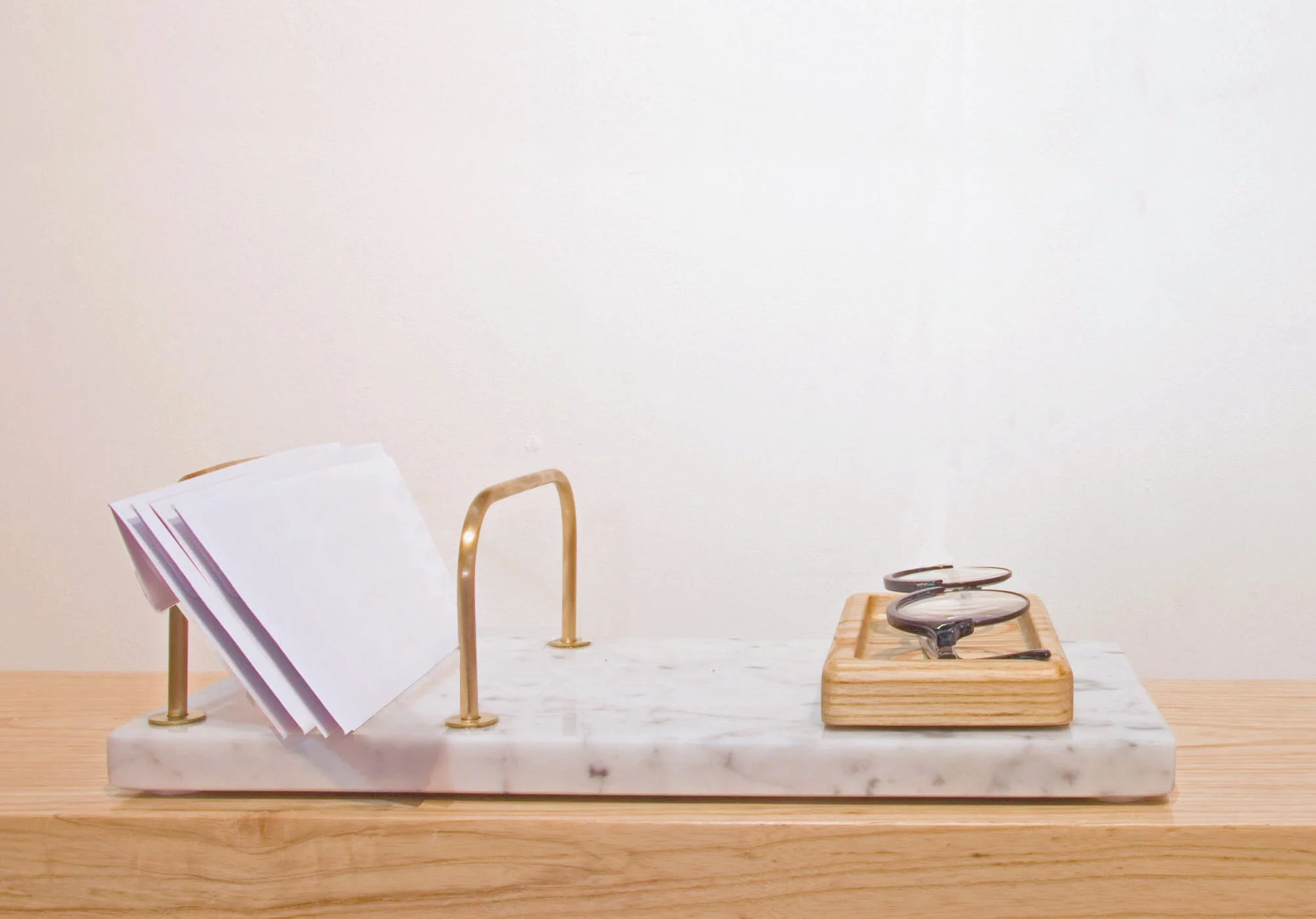 Reclaimed Cararra marble, solid ash, solid brass.